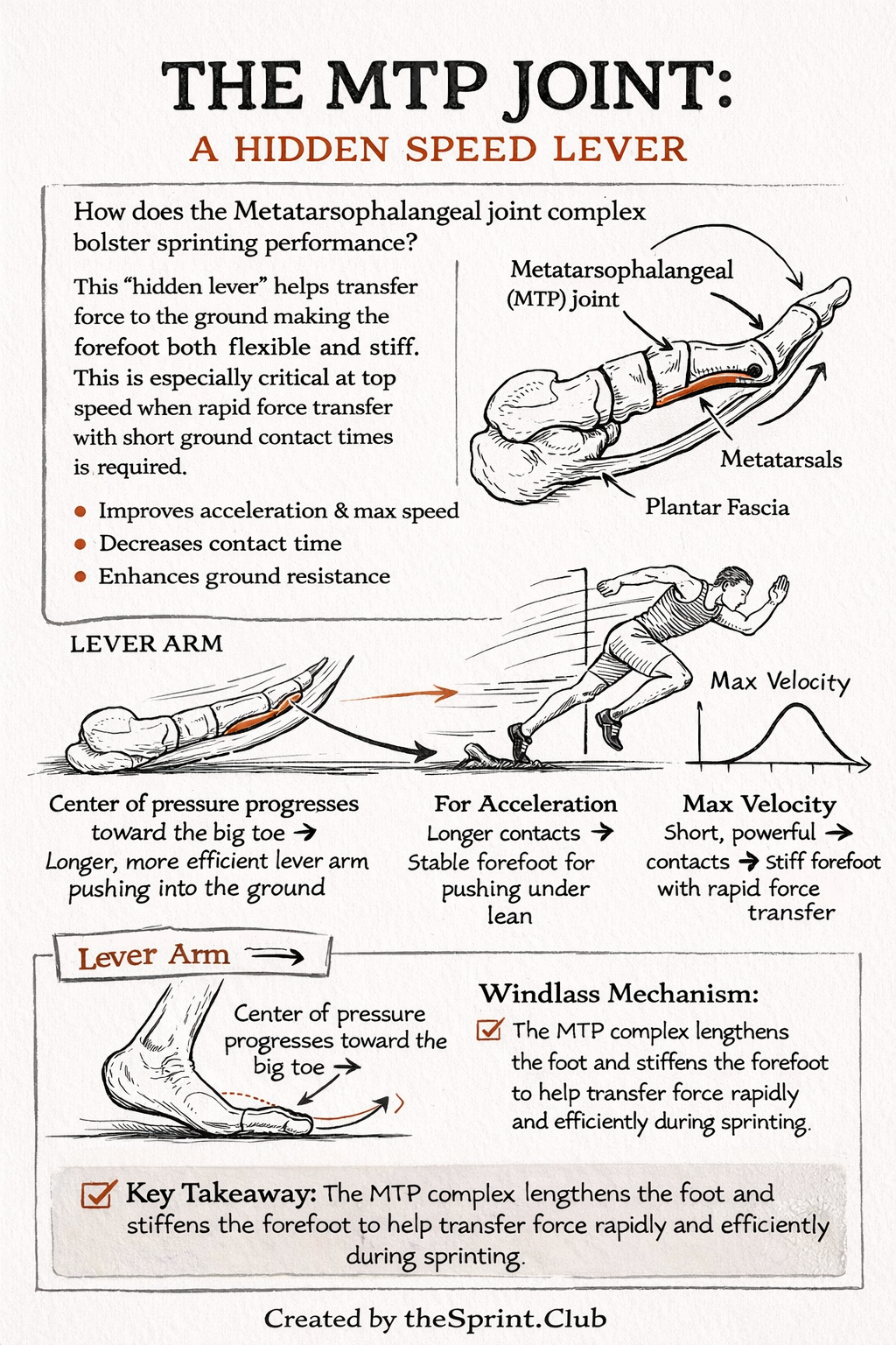 Diagram showing the MTP joint and plantar fascia functioning as a lever to stiffen and lengthen the forefoot for sprinting.