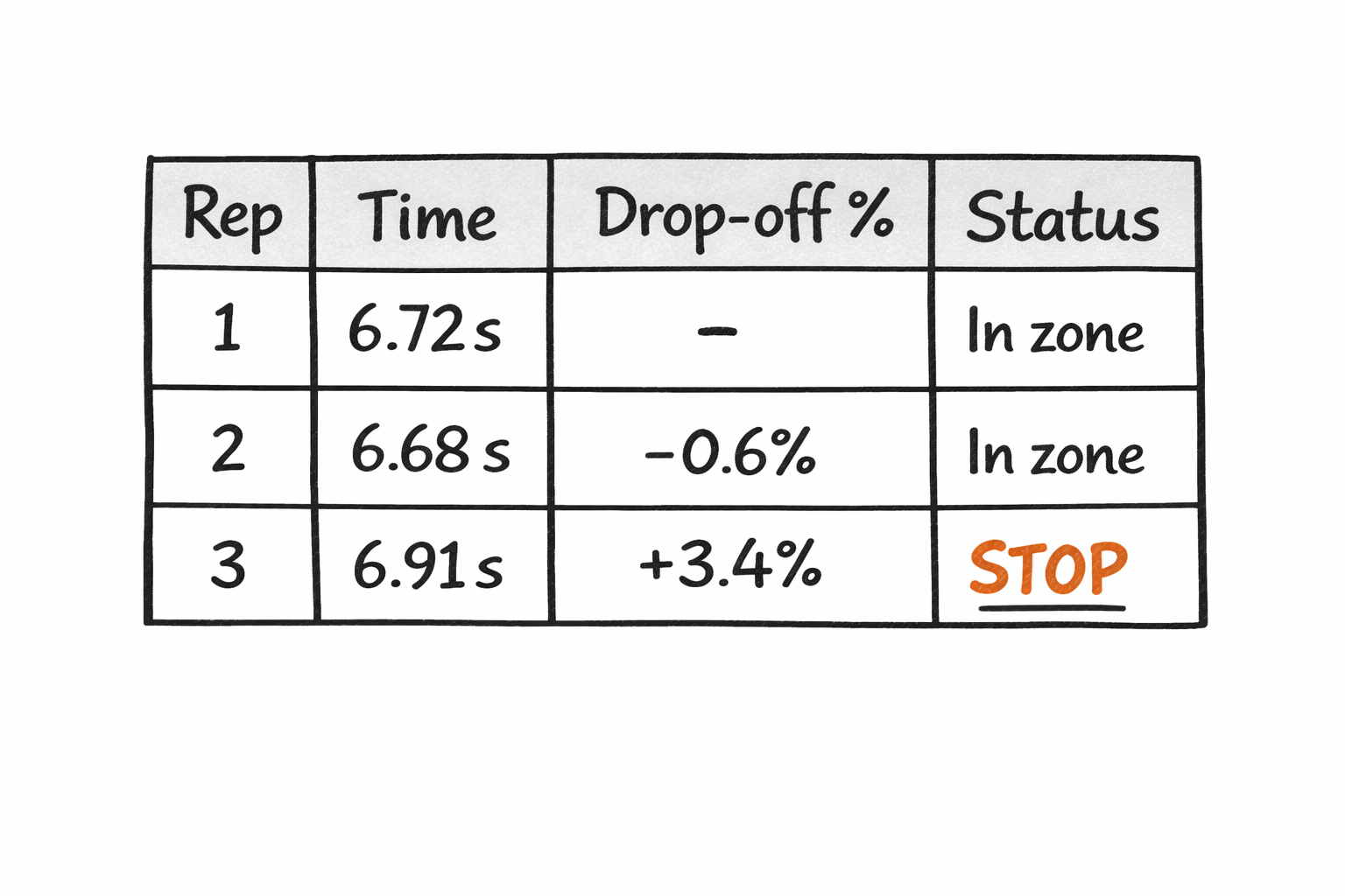 Table of three reps with times 6.72s, 6.68s, 6.91s; drop-off -, -0.6%, +3.4%; statuses In zone, In zone, and orange underlined STOP.